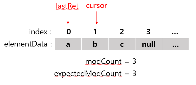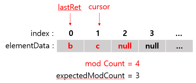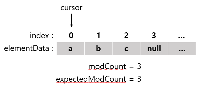 while문을 돌기전의 Iterator의 그림이다. add()가 3번 동작했기 때문에 modCount는 3이 되었고 그상태에서 iterator()를 호출하였기 때문에 expectedModCount도 3이다.
