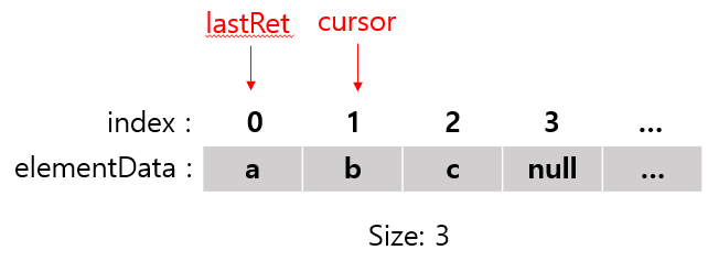 반복문에서 첫번째로 next()가 실행되면 cursor로 가리키고 있던 값을 lastRet으로 대신 가리키도록 하고 cursor는 다음 요소를 가리킨다. 그 후 lastRet이 가리키고 있던 값을 리턴한다. 간단히 표현하자면 next()는 cursor가 가리키는 요소를 출력하고 다음 요소를 가리키도록 한다.