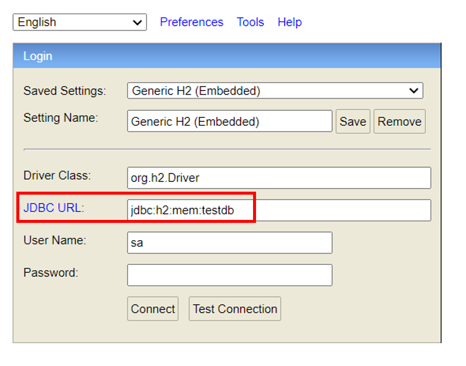 웹 브라우저에서 http://localhost:8080/h2-console로 접속하면 다음과 같이 웹 콘솔 화면이 등장한다.