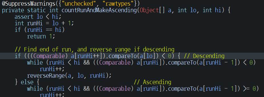 를 부른다. Timsort와 ComparableTimsort의 차이는 비교방식의 차이이다. 사용되는 메서드를 보면 확실히 알 수 있다. 순서대로 ComparableTimsort