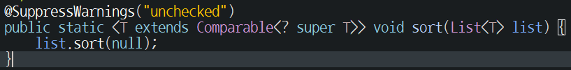 Collections.sort가 정의된 코드이다. 제네릭 타입이 약간 복잡하게 되어있는데 간단히 말하자면 Comparable을 구현한 T를 요소로 가지는 List만이 메서드의 인자로 사용될 수 있다는 의미이다. 이렇게 인자를 제한함으로써 컴파일 단계에서 오류를 잡아낼 수 있게 되었다.