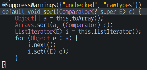 Arrays.sort와는 다른 정렬 알고리즘을 사용할까? 결론부터 말하면 그렇지 않다. 아래의 코드는 List에 정의되어있는 sort메서드이다. List는 자신과 같은 데이터를 가진 오브젝트 타입 배열을 복사해내는 toArray()